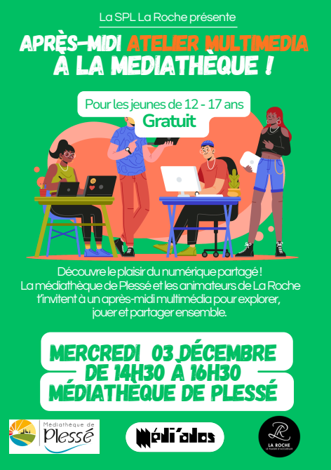 Atelier multimédia Atelier multimédia Le mercredi 07 janvier 2026 de 14:30 à 16:30 Public : 12-17 ans Infos Gratuit et entrée libre Durée : 2H Public Ados Lieu Plessé Lire la suite Catégorie Atelier Tags Plessé Gratuit